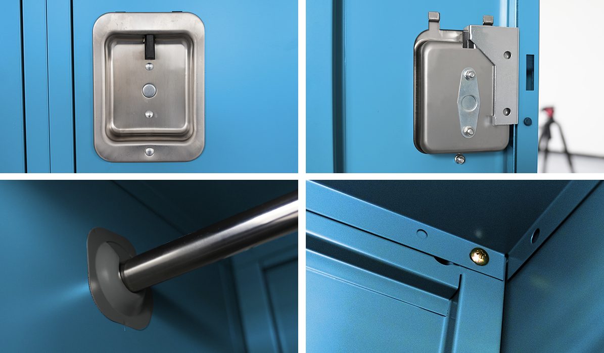 02 The Metal Lockers are ideal for colleges, high schools, locker rooms, employee changing rooms, government agencies, gyms and many other applications. Constructed of high quality cold rolled steel. 25% wider than standard lockers. Available as knocked down or assembled packs. Feature a durable powder coated finish available in gray, tan or blue. Units include a stylish handle and recessed hasp for added security and can accommodate built-in combination or key locks and combination or key padlocks.