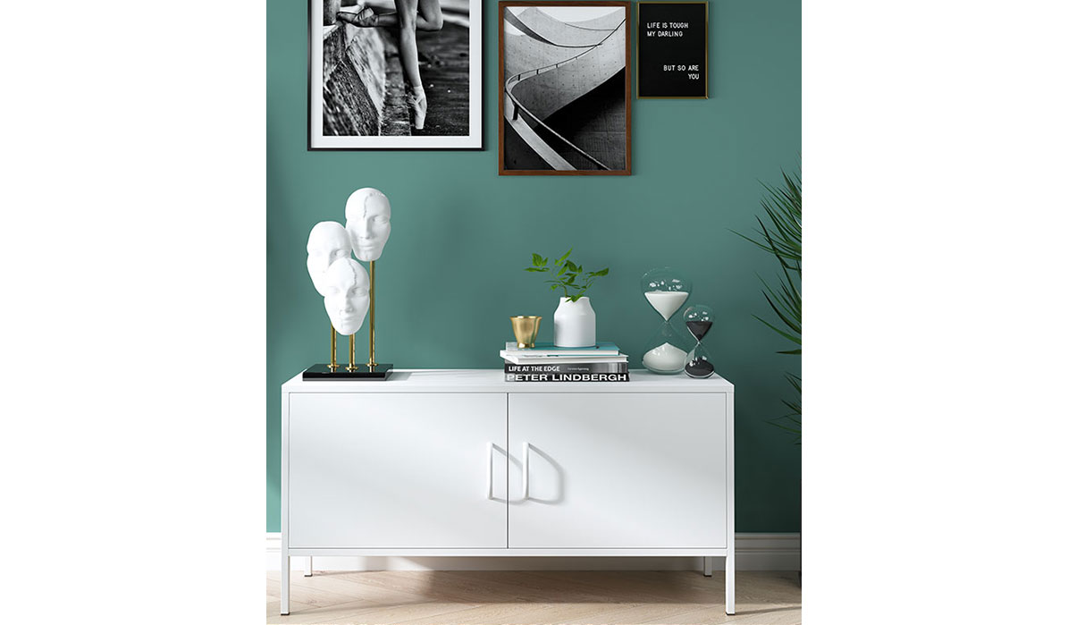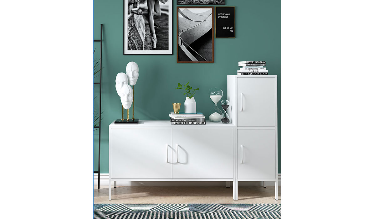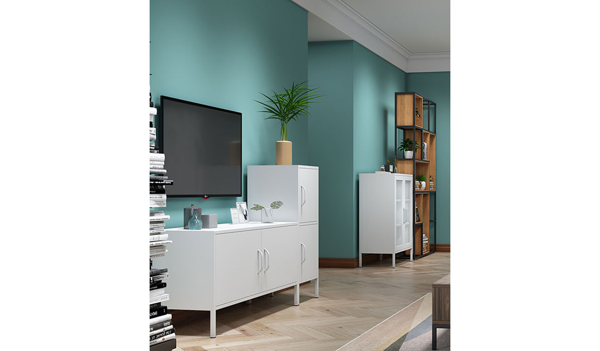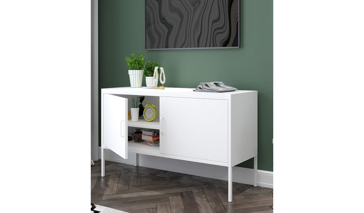 When lots of storage is needed, the brand new four-door filing cabinet delivers. This TV Stand uses modern design to create a contemporary yet classic look that enhances the style and functionality of any room in your home. It features eight filing shelves inside, with doors that keep everything concealed. Perfect for organizing a contemporary space, the cabinet features a bright white finish that complements any space. Add decorative accessories to the top to create a stylish addition to a living area or home office. A convenient combination of cabinet space and table surface area, this modern media center accommodates can bearing up to 100kg, making it a wonderful and solid choice in your living room or den, bedroom, entertainment area and more