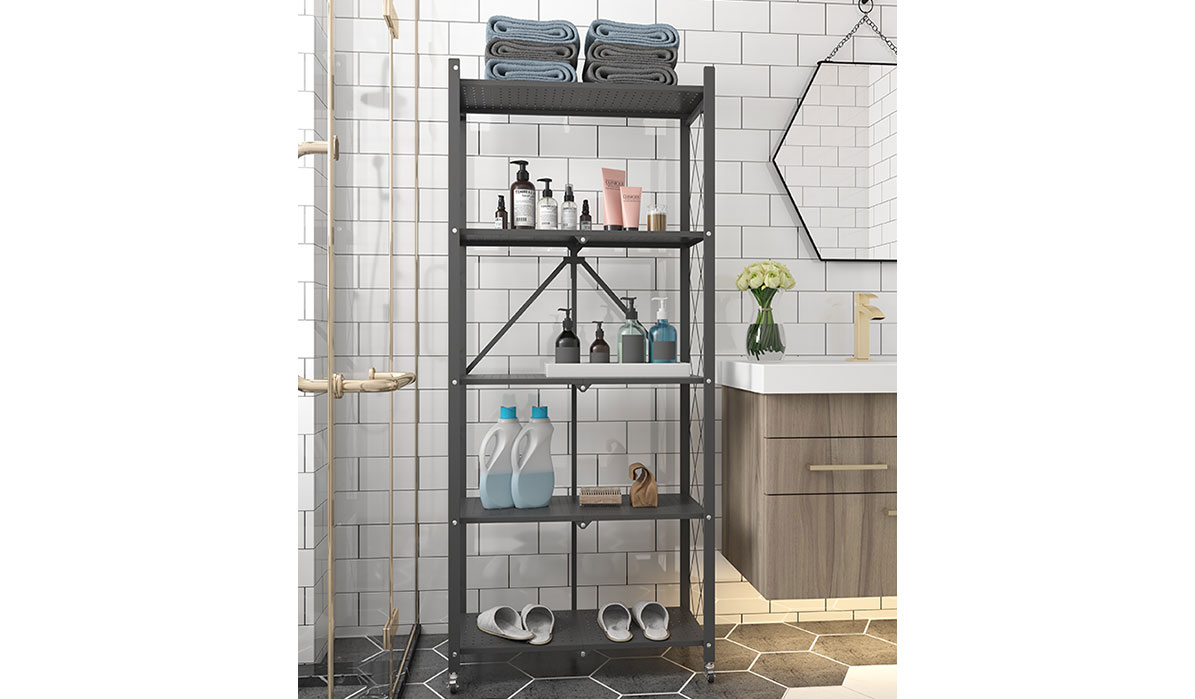 This foldable storage shelf is easy to assemble with no tools required. The 3-tire foldable storage rack arrives assembled, all you need to do is open the frame and adjust the Shelves on it. The entire process takes less than 30 seconds. This shelf organizer unit has a load-bearing of 50 lbs for each row. Sturdy and durable metal construction make it industrial grade. Great for storing tools and large appliances. This metal 3-shelf shelving unit design perfect for your living room, bedroom, kitchen, office, garage, and more. The 3-layer spacious design makes more space for storage. the width is only 8cm when folded.The height on each layer not only create more additional space but also keep your home clean and orderly. The metal wire rack has 4 easy-glide durable wheels with 360° rotation,2 wheels with brakes make this shelving unit more stable.