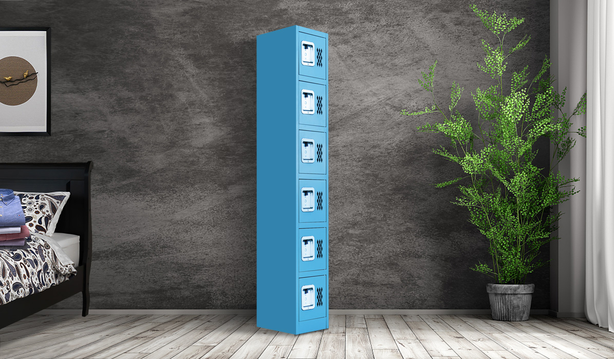 02 The Metal Lockers are ideal for colleges, high schools, locker rooms, employee changing rooms, government agencies, gyms and many other applications. Constructed of high quality cold rolled steel. 25% wider than standard lockers. Available as knocked down or assembled packs. Feature a durable powder coated finish available in gray, tan or blue. Units include a stylish handle and recessed hasp for added security and can accommodate built-in combination or key locks and combination or key padlocks.