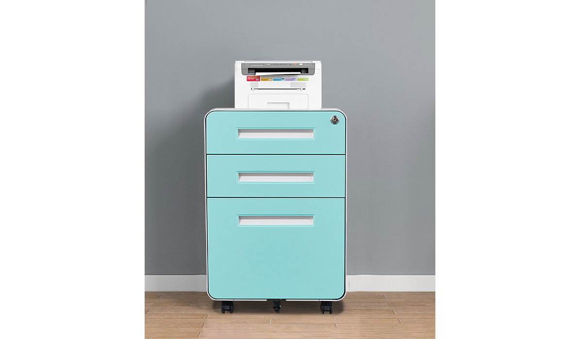 A mobile pedestal cabinet unit with three drawers. Small and can go under a desk. Non-attachable. Keep important documents and work supplies organized and secured with this three-drawer rolling file cabinet. The large lower drawer accommodates letter or legal-size files, while the two upper drawers provide space for smaller items. Five casters allow this file cabinet to easily move wherever you need it. Crafted from high-quality steel with a high-gloss finish, this cabinet is designed to provide years of use in your home or office. Lock the drawers with important documents for added safety.